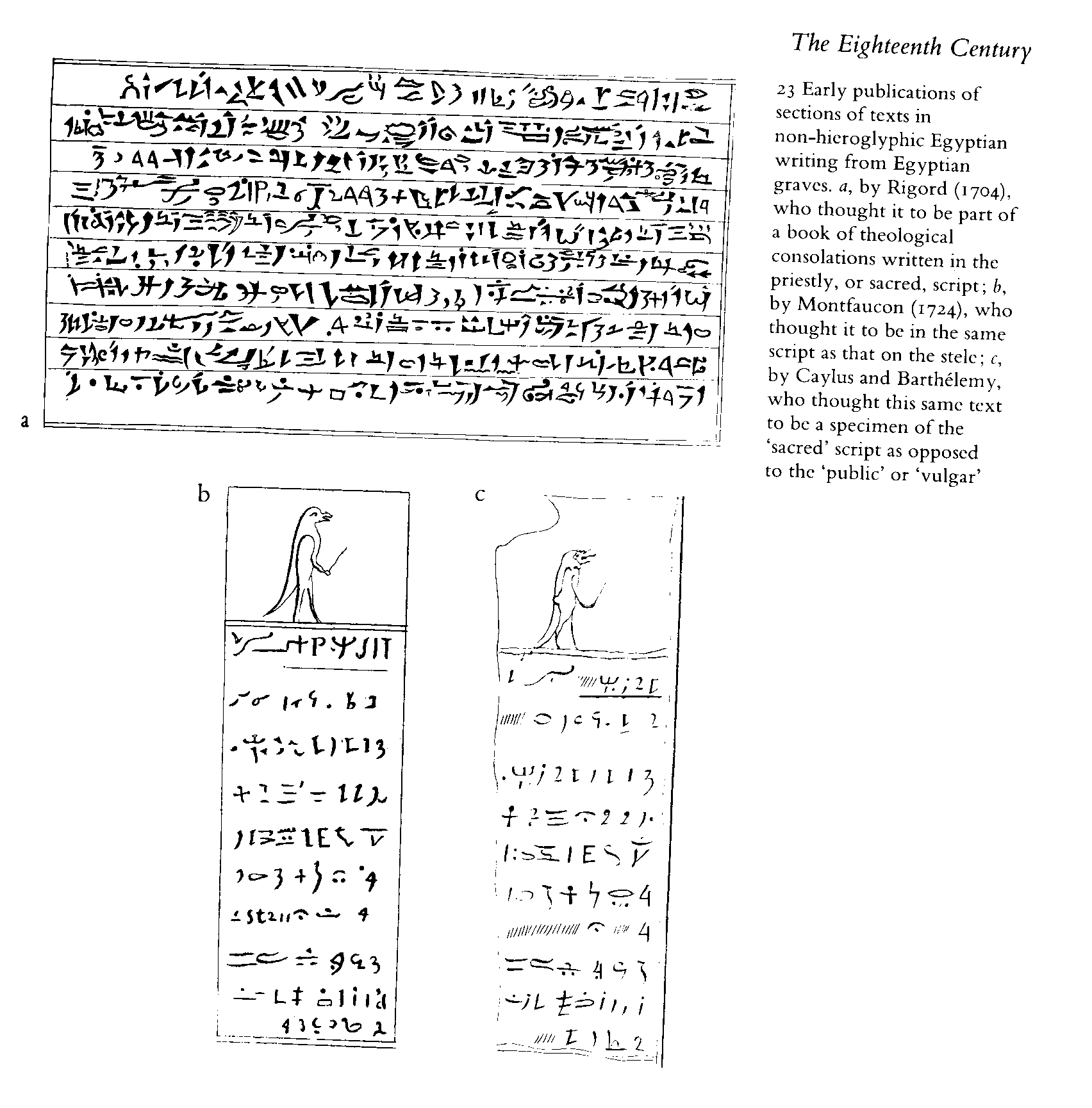 Another interesting point is that (to me at least), Joseph Smith’s characters look a lot more like the graphic marked (c) in the above than they look like the graphic marked (b). Graphics (b) and (c) are two different published transcriptions of the same text, placed side-by-side to illustrate how published transcriptions of Egyptian writing from the eighteenth century varied in quality. The Caylus and Barthelemy verson (marked c) is the less accurate one. Caylus and Barthelemy published in the 1750’s, and recognized that this was non-heiroglyphic Egyptian writing. (It was later found to be Coptic script.)