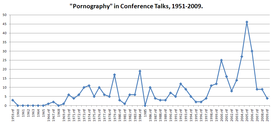 References to pornography in General Conference address have coincided with the availability of pornography, as this graph illustrates: