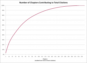 The next chart might be a little hard to interpret, but highlights some interesting facts. I ordered the chapters by the number of citations from most to fewest and measured the running total of citations. It produced a satisfying logarithmic curve.
