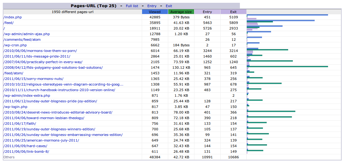 I was doing some site maintenance on the server and decided to check the stats for MSP while I was at it. I noticed something interesting and thought it might be worth mentioning here. Since May, this post I wrote last year has been either the top or second highest viewed post on MSP: “What’s with Mormons and Porn?” I haven’t been out promoting it, but it is the second link on Google when you search for “Mormons + Porn“. Here’s a screenshot from June: