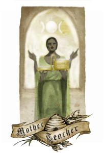 We also had A LOT of fun coming up with illustrations for essays by noted feminist scholars Janice Allred and Margaret Toscano. I’m pretty sure it was originally Galen’s idea to depict Heavenly Mother in four different manifestations, and she wanted some sort of way of unifying them. My suggestion: “one thing that struck me was the similarity of the four images you propose with the queens in the tarot deck.” Galen didn’t limit herself to a strict adherence to what the suits represent or how they’re expressed, but that was useful. We played with different ways to Mormonize the images–one easy thing was to add a beehive to each. But the most fun was to make the Goddess of Cups, the “Mother Nurturer,” a hot blonde pioneer woman in a prairie dress offering you a long cool drink of water while a wagon train passes in the distance behind her.