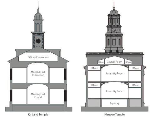 The difference is the offices. (And the baptistry, to get people used to the idea of bathing.) Pay special attention to the top floor. Naturally you would expect washings to take place in the basement, where the water was, right? Yet Joseph wanted the washing to take place on the top floor. When Joseph died, Brigham Young changed it to the bottom floor like any sensible person: